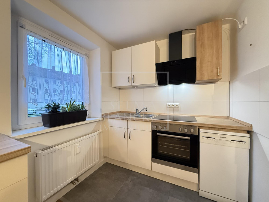 Die Wohnung bietet eine großzügige Wohnküche, ein kompaktes Wohnzimmer mit Zugang zum Balkon sowie ein geräumiges Schlafzimmer. Das Badezimmer ist modernisiert und mit einer Wanne und einem Fenster ausgestattet.